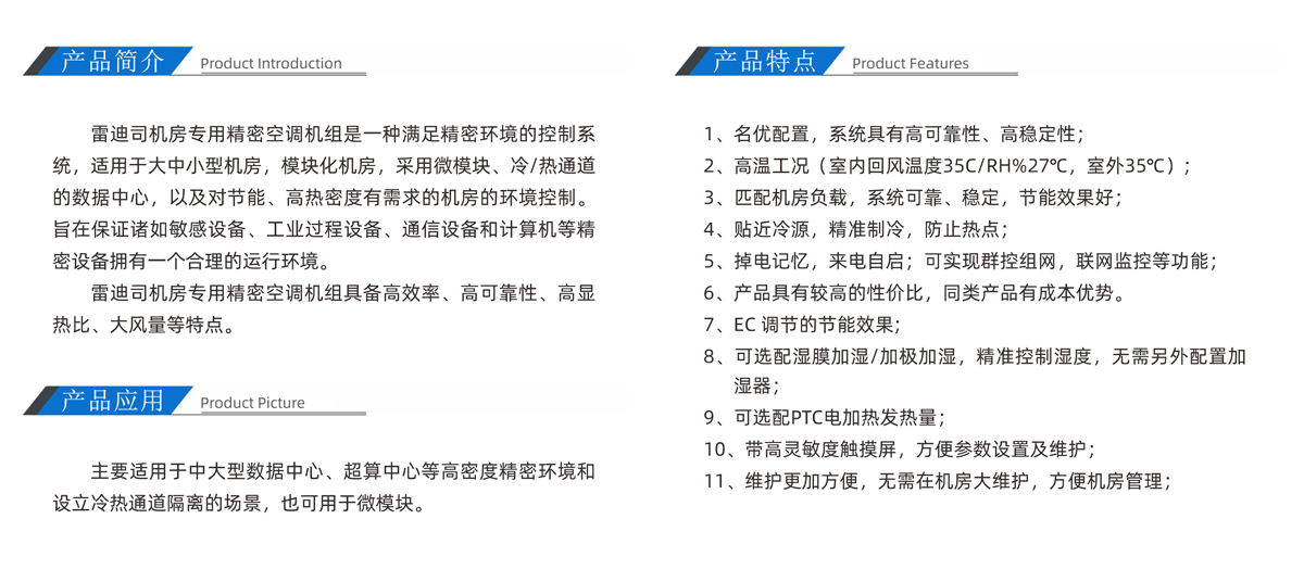 雷迪司LSA系列機房專用精密空調機組是一種滿足精密環境的控制系統,適用于大中小型機房,模塊化機房,采用微模塊、冷/熱通道的數據中心,以及對節能、高熱密度有需求的機房的環境控制。旨在保證諸如敏感設備、工業過程設備、通信設備和計算機等精密設備擁有一個合理的運行環境。